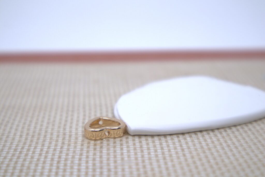 Remove any excess clay from the outside of the frame with your fingers and/or cutting tool. If the clay is overflowing the top of the frame gently push it down. Scrape off any excess clay from the back of the frame. Depending on your design, the clay can sit flush with the top of the frame or, if you want a doming effect push the clay from the back of the frame with your finger or a clay tool. Be sure to keep the back of the frame flat to ensure an even surface for the earring posts that will be glued on later.